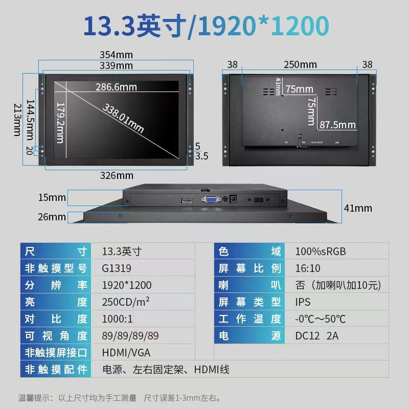 13.3寸開(kāi)放式高清顯示器1920*1200IPS屏全視角100%SRGB工業(yè)顯示器